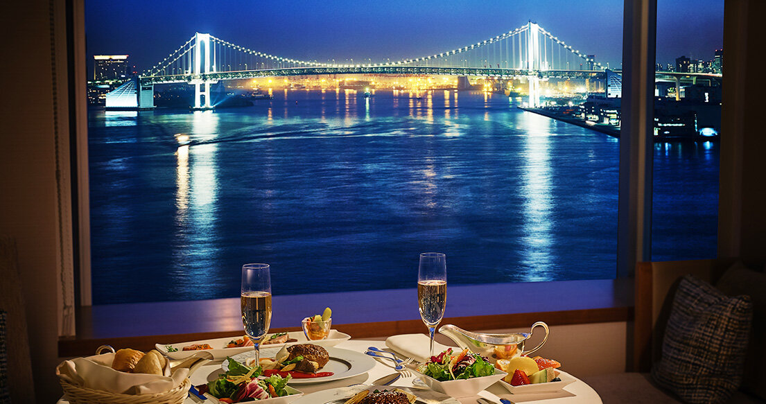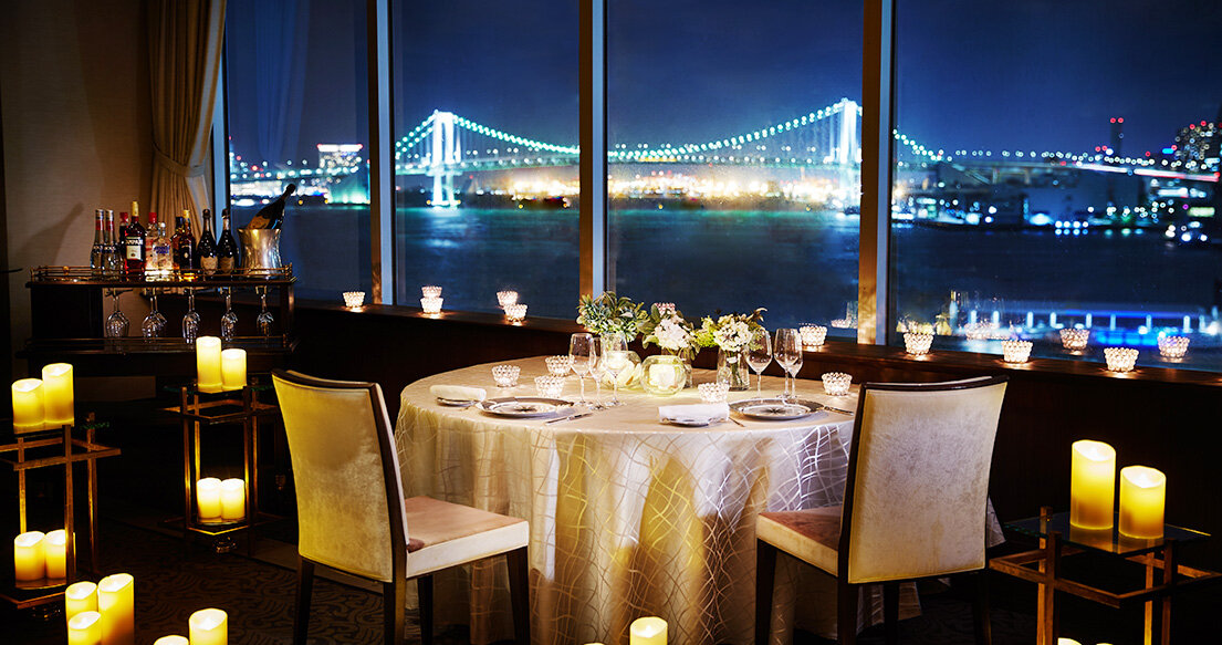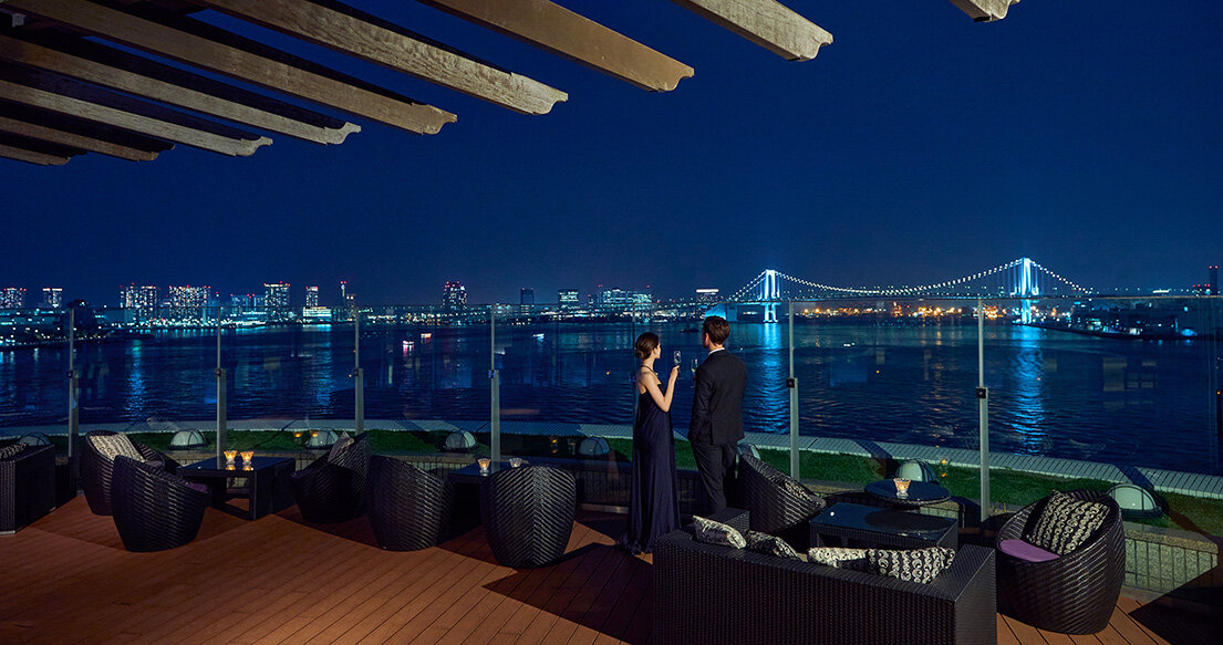 Overlooking the shimmering lights of Rainbow Bridge, Manhattan sets the stage for an unforgettable anniversary.