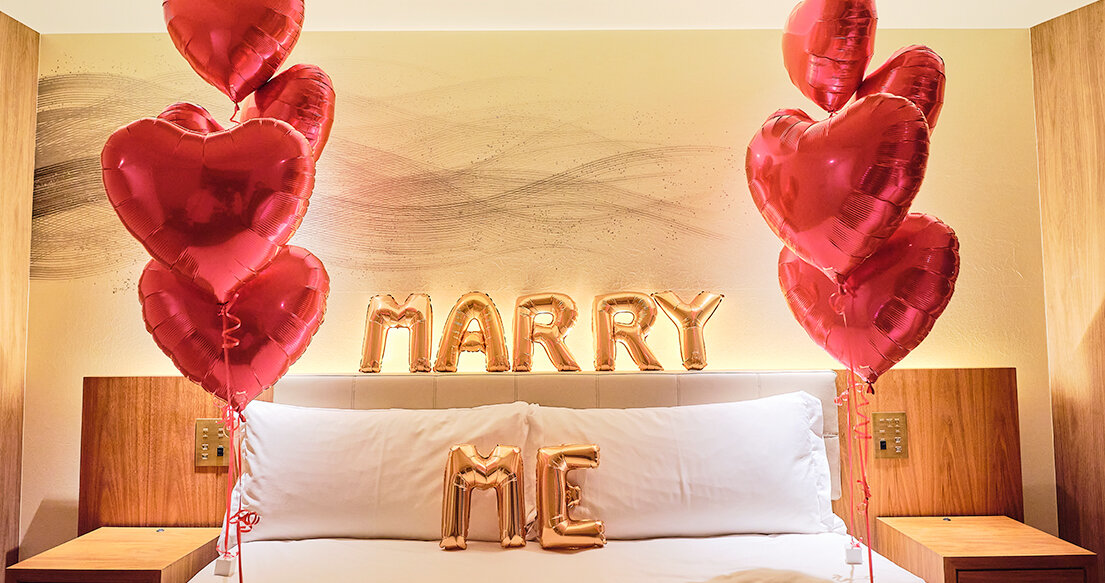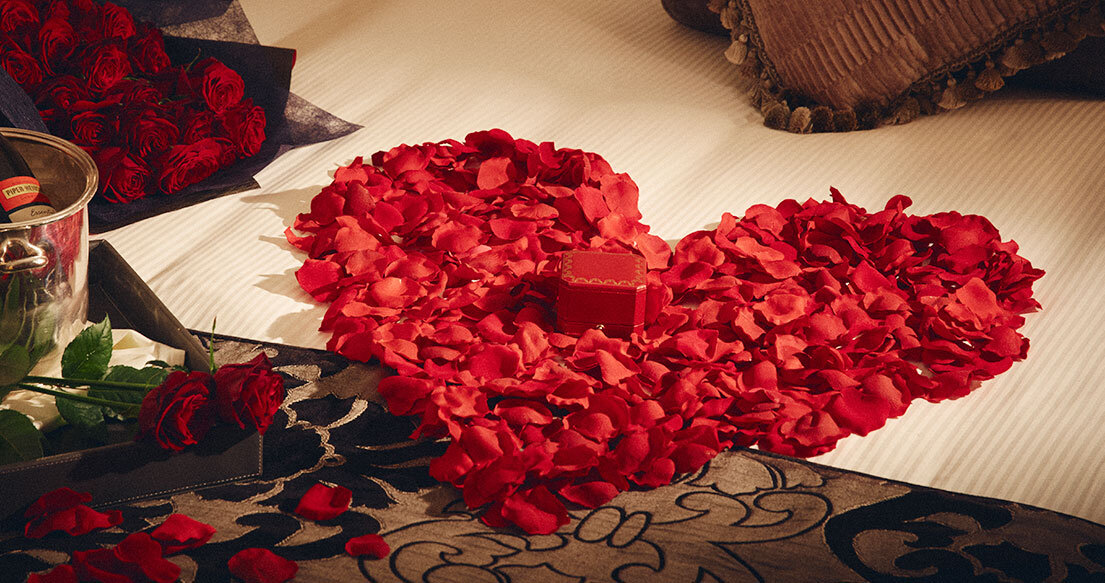 While you enjoy an elegant dinner, your guestroom is secretly transformed. Rose petals in the shape of a heart, red balloons, and a bouquet of roses await your return. The evening unfolds with a rose-scented bath and glittering waterfront views.
