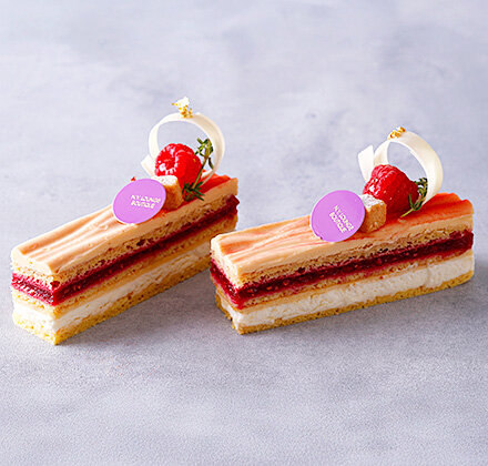 繊細なビスキュイの層に、ホワイトチョコレートのクリームとベリーのジュレを重ね、ふわりと薔薇の香りを纏わせました。いちごのバタークリームがやさしく包み込む、気品あふれる味わいです。
