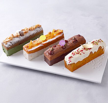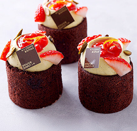 ピスタチオのカッサータとオレンジマーマレードの二層を重ね、まわりをやさしい甘酸っぱさのいちごムースで包みました。ナッツとフルーツが織りなす、奥行きのある味わいをお楽しみください。