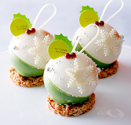 クリスマスオーナメントをイメージした抹茶のケーキ。濃厚な抹茶ガナッシュとラズベリージュレを包み、洋ナシ香るレアチーズムースを抹茶チョコと銀箔グラサージュで艶やかに仕上げました。
