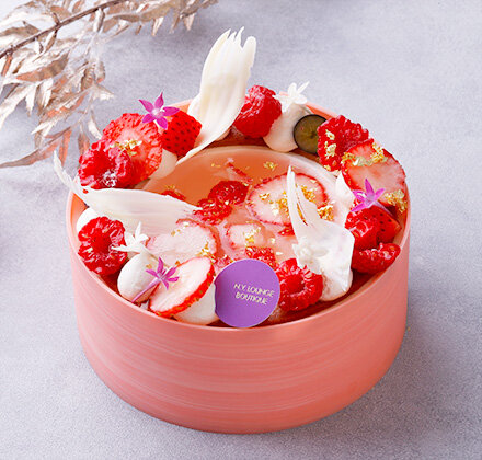 宝石の輝きを思わせる、1年のはじまりにふさわしい贅沢なお正月限定ケーキです。ケーキの中心には程よい甘みと酸味が絶妙に調和したストロベリージュレとストロベリームースを重ね、その周りをなめらかなフロマージュムースで包み込みました。新年のあたたかな食卓を彩る、祝福の逸品です。