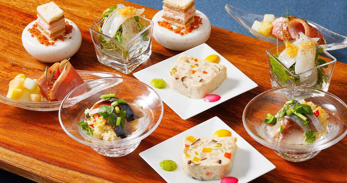 総料理長・中宇祢を筆頭に、フレンチ、イタリアン、鉄板焼など各レストランのシェフ8名が集い、それぞれの技と感性を生かした華やかなメニューを披露します。