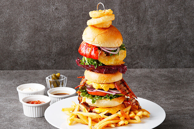 高さ約30cmの迫力を誇る、ラウンジ限定スペシャルバーガー。上から、オニオンリング、オマール海老、白身魚のフリット、レタス、トレヴィス、ベーコン、オニオン、トマト、さらにチェダーチーズを添えたビーフパテを2枚使用し、食べ応えのあるバーガーに仕上げました。付け合わせには、フライドポテト、ピクルスの他、3種のソースとともにお楽しみいただけます。