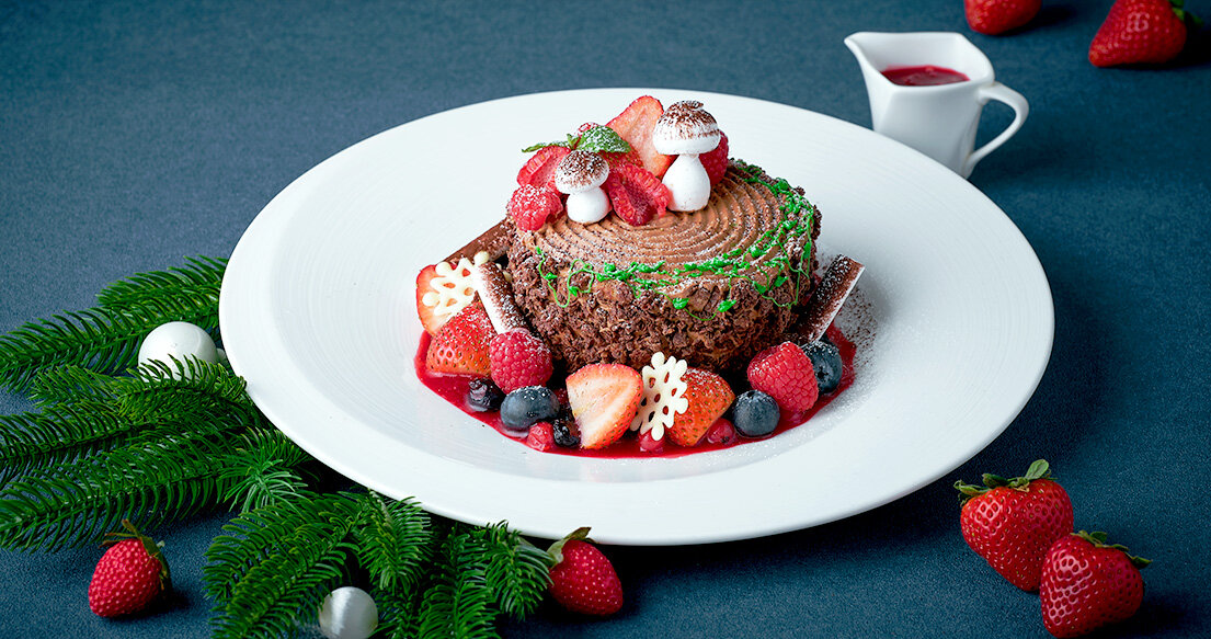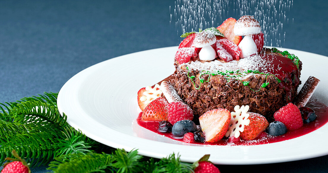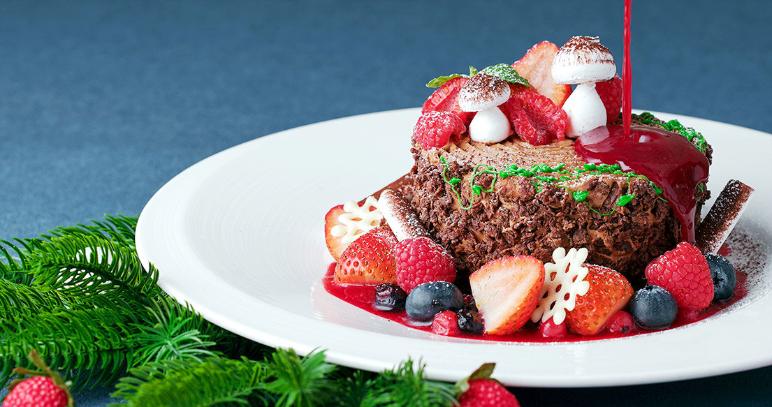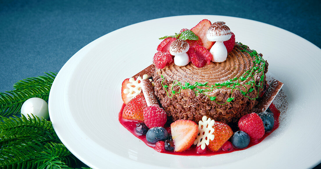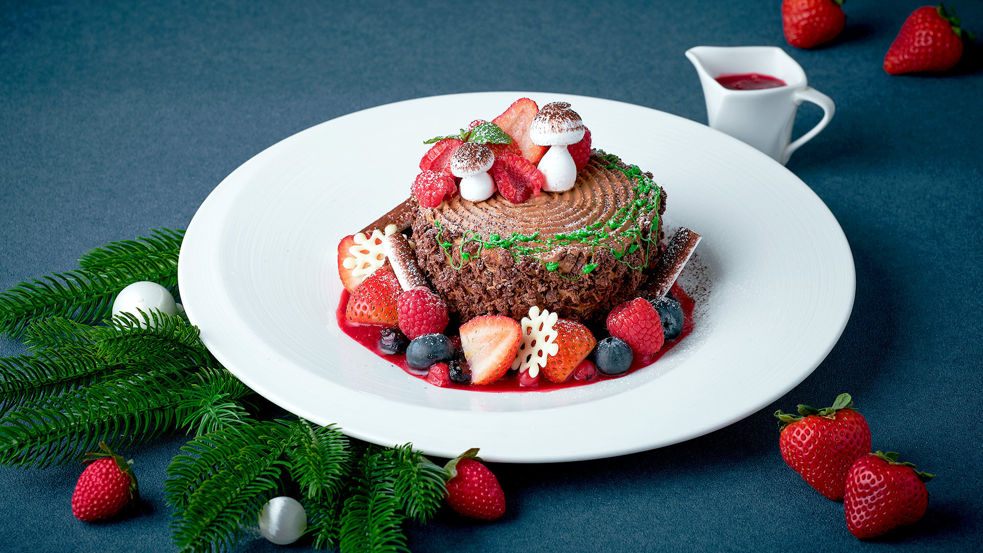 メレンゲのきのこやチョコクランチ、いちごやベリーが聖夜の森の華やぎを表現し、見た目にも味わいにも心躍る、フェスティブシーズンにふさわしい一皿に仕上げました。
