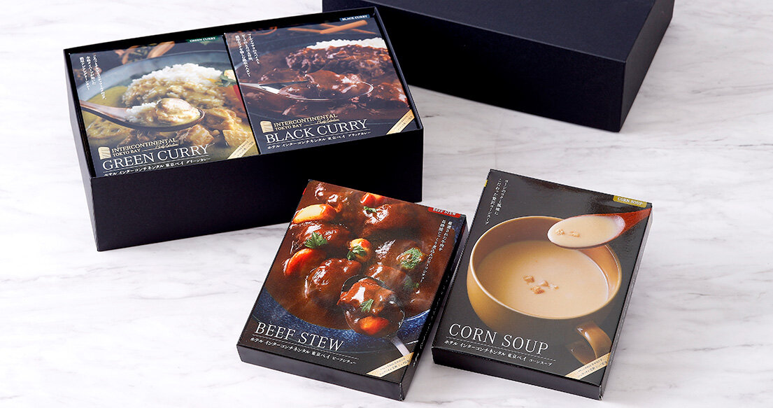 シュバリエを受勲した総料理長 中宇祢 満也(なかうね みちや)が監修した「レトルトカレー2種(ブラックカレー・グリーンカレー)、ビーフシチュー、コーンスープ」を専用BOXに詰め合わせてご用意。