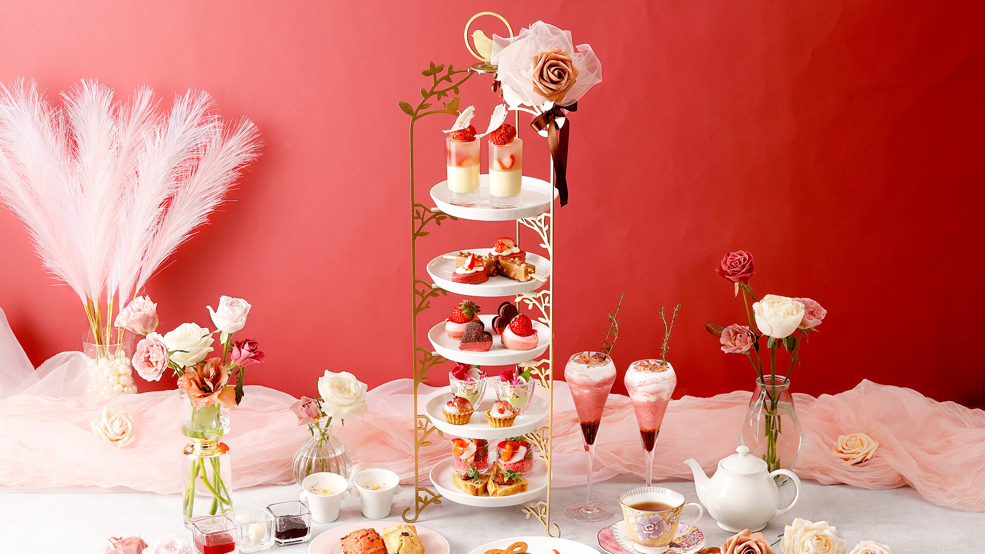 音楽をテーマにした赤やピンクの愛らしいスイーツとセイボリーが、ご自宅でのティータイムを華やかに彩ります。
