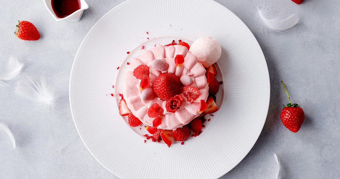 淡いピンクカラーの華やかなストロベリーパンケーキ。