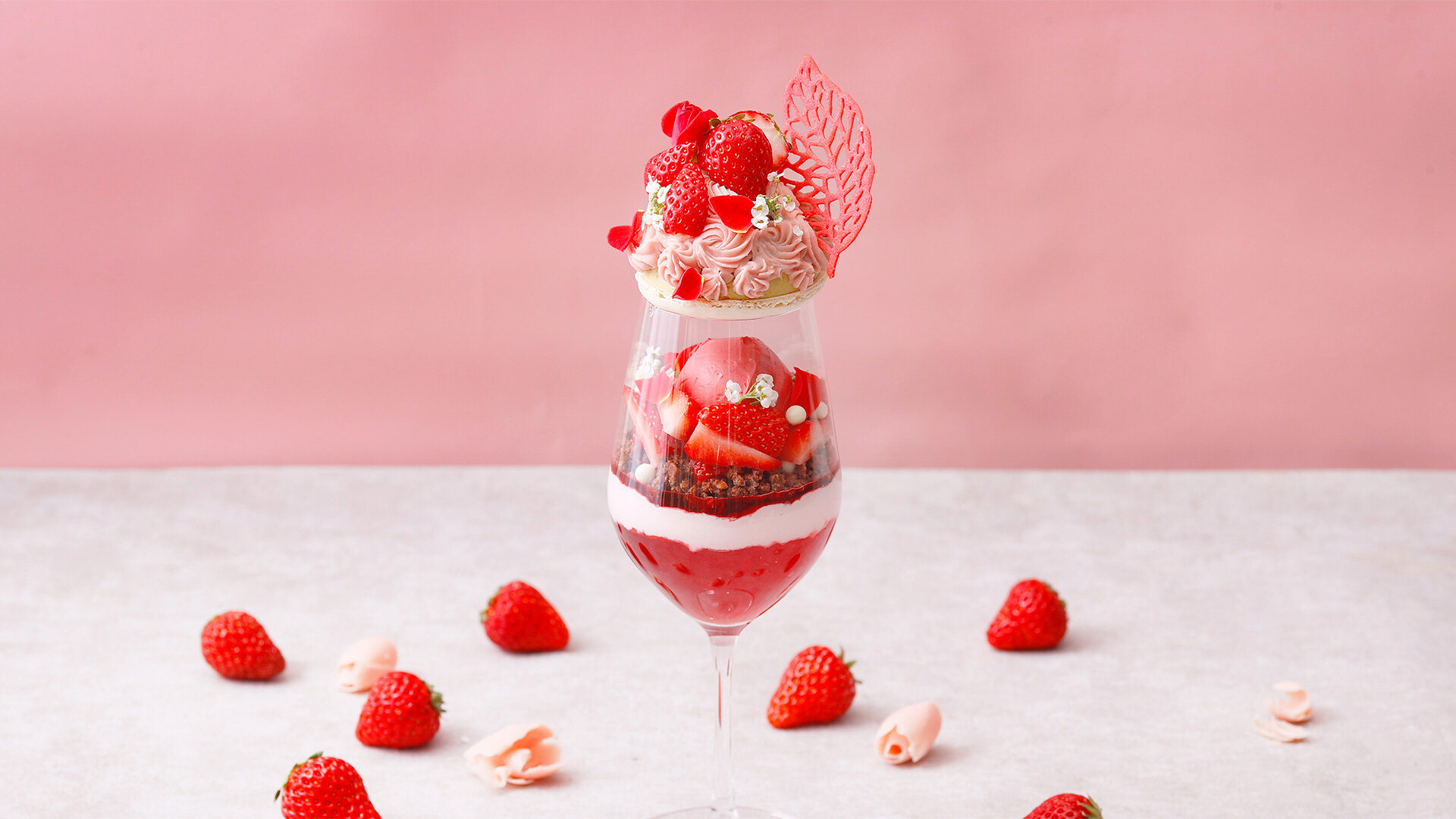 旬の完熟いちご「紅ほっぺ」に華やかなローズの香りを重ねた、春爛漫のパフェを期間限定でご用意。真っ白なマカロン皮の上にローズのように絞ったガナッシュモンテを重ね、ピーカンナッツやいちごを忍ばせたローズガトーが印象的な一品に仕上げました。