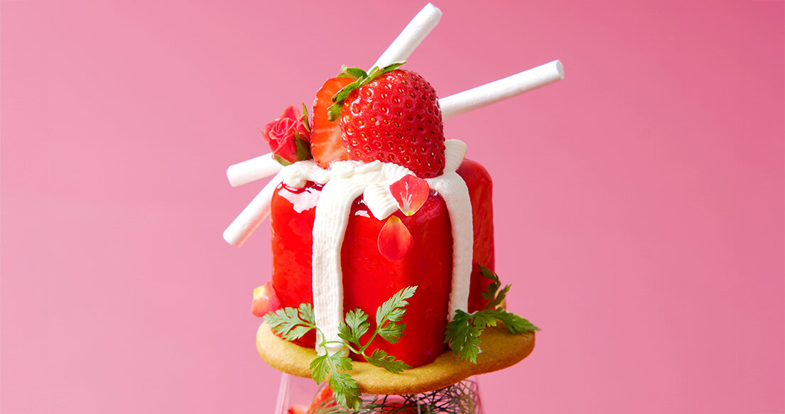 ギフトボックスは口当たり軽やかないちごムースで形作られ、中には爽やかな酸味のオレンジジュレを忍ばせました。