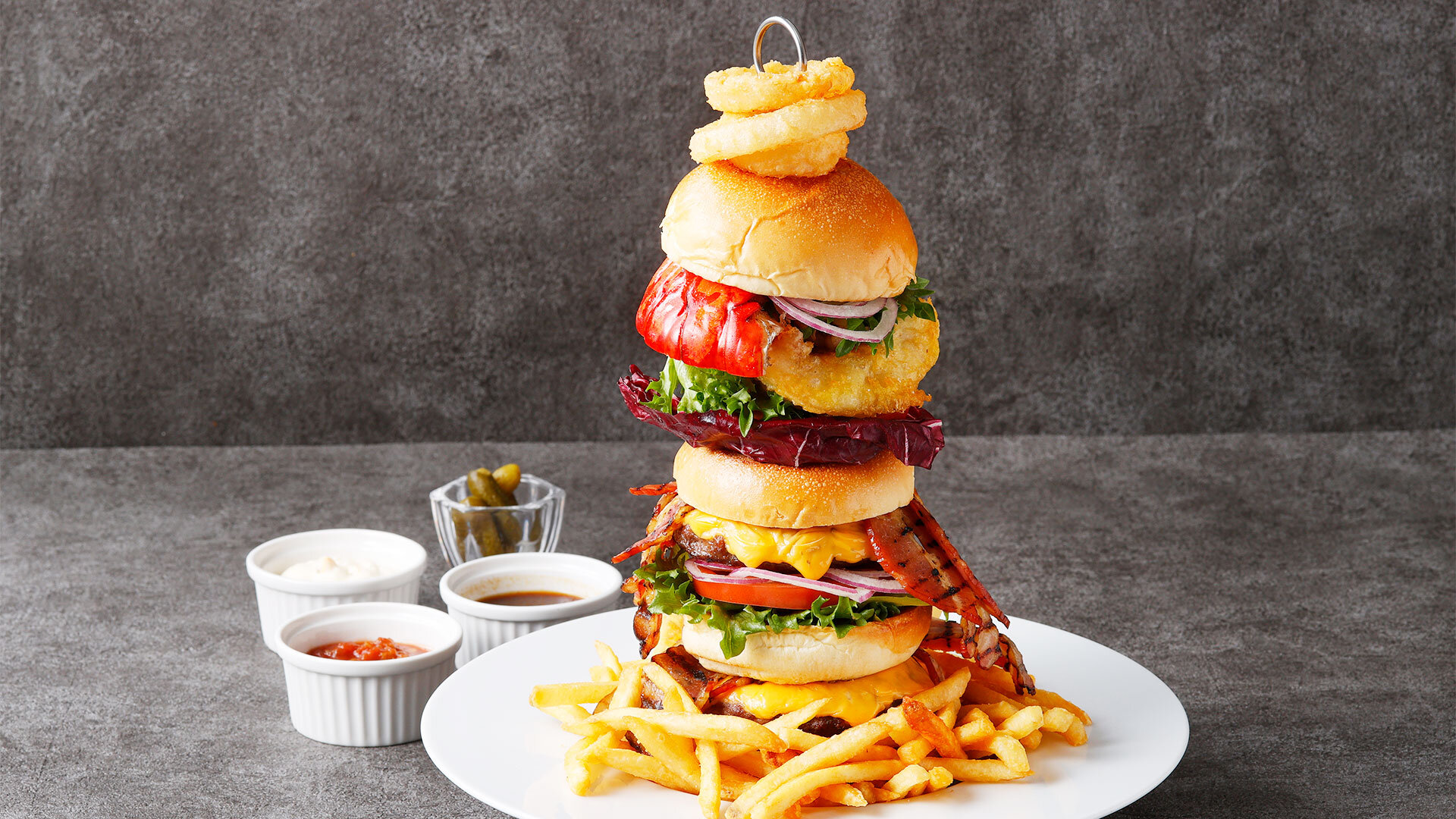 上から、オニオンリング、オマール海老、白身魚のフリット、レタス、トレヴィス、ベーコン、オニオン、トマト、さらにチェダーチーズを添えたビーフパテを2枚使用し、食べ応えのあるバーガーに仕上げました。付け合わせには、フライドポテト、ピクルスの他、3種のソースとともにお楽しみいただけます。