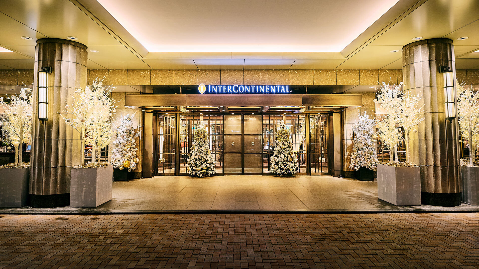 エントランスには、10本のクリスマスツリーとともに、約60mのイルミネーションが施されています。