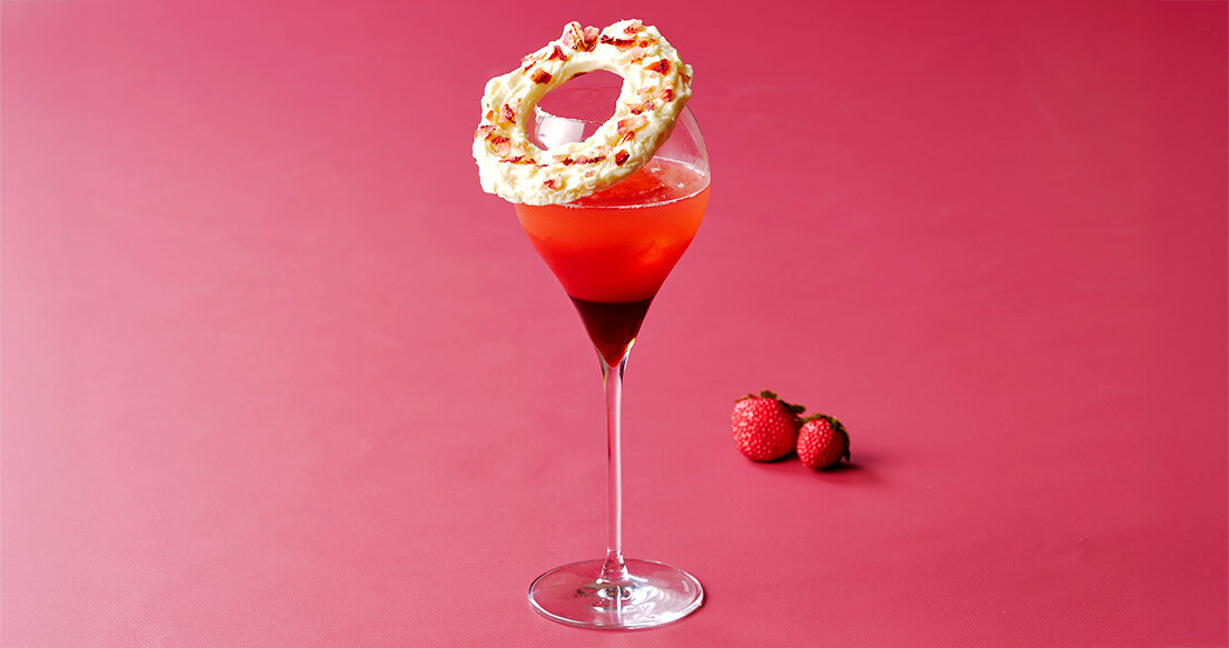 甘酸っぱいいちごとまろやかなマスカルポーネチーズが織りなすデザートカクテルは、長期熟成ラムを使用し、クレームブリュレを思わせる香ばしくほろ苦い風味に仕上げました。