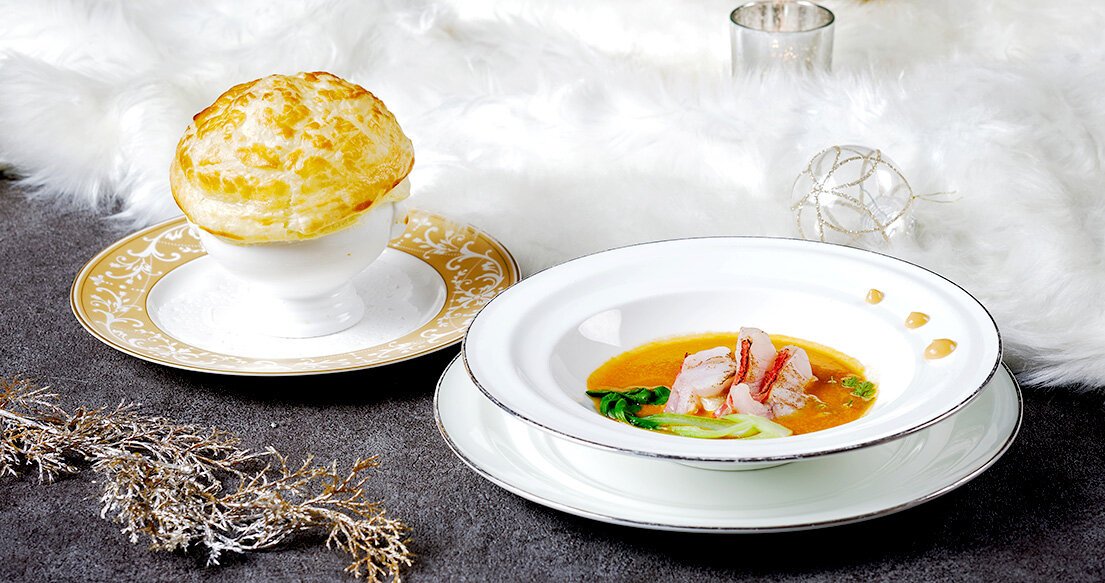 華やかな【パレット・アート・オードブル クリスマスバージョン】から帆立貝のブイヤベースやオマール海老、北海道産鴨肉とフォアグラのパイ包み焼きなど厳選肉料理で聖なるプロヴァンス郷土料理を堪能。