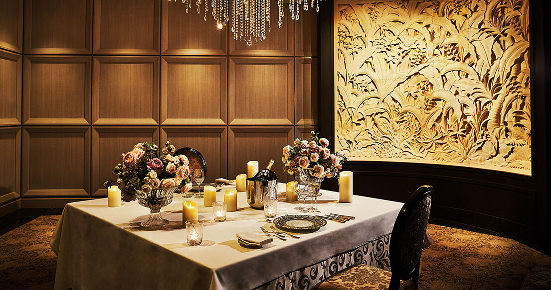 華やかな個室をお二人だけのための特別席としてご用意。シャンパンの至宝「ペリエ・ジュエ ベル・エポック」の乾杯で始まり、最高級ブルターニュ産のオマール海老や阿蘇あか牛など、豪華食材溢れる本格フランス料理をご堪能いただけます。
