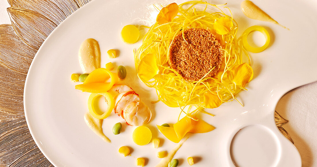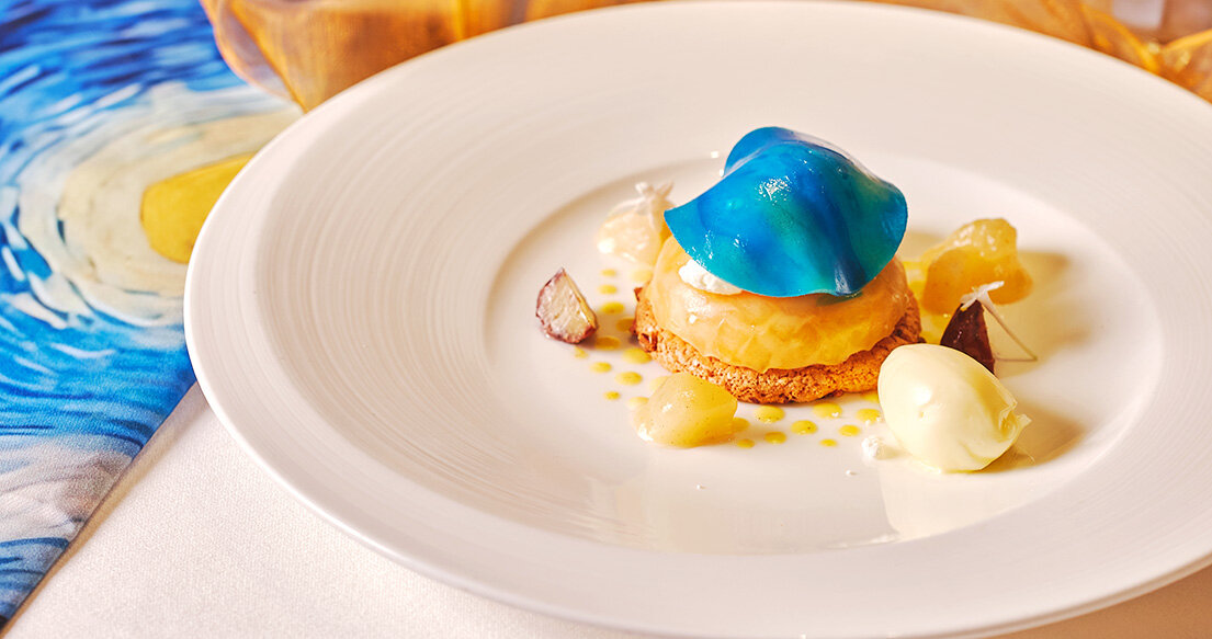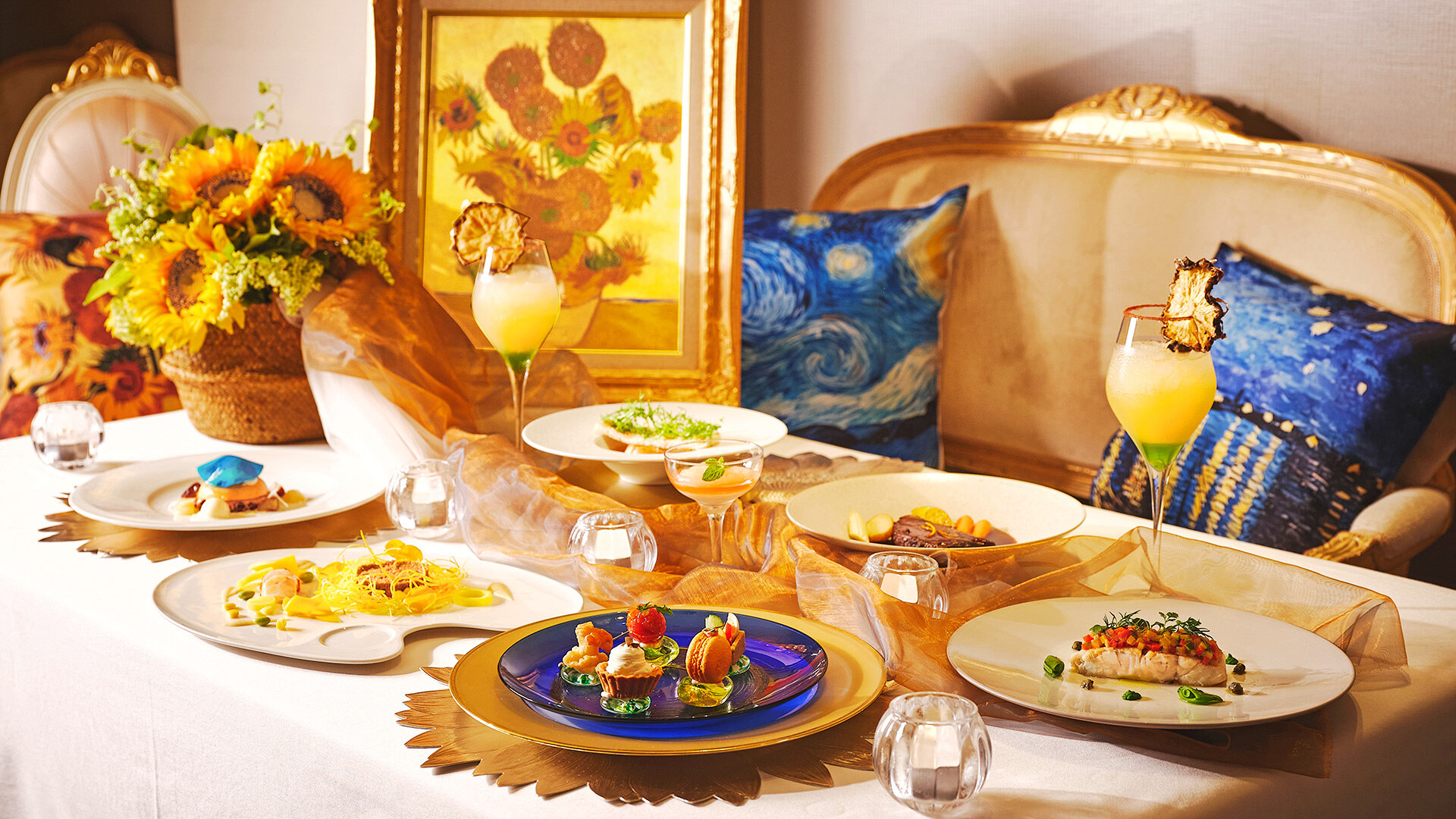 「ひまわり」や「星月夜」などの代表作をモチーフに、アルルの陽光や鮮やかな色彩、静かな夜の情景までを一皿ごとに表現しました。