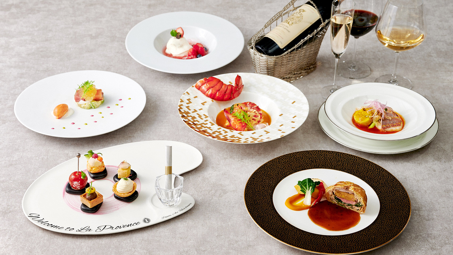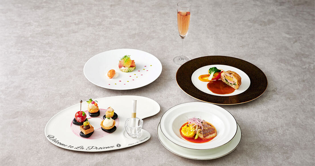 シェフの芸術性に富んだ前菜<パレット・アート・オードヴル>に伝統的なブイヤベースや熟成牛ロース肉のグリエをご用意。
