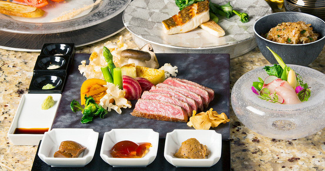 ヘルシー・ビューティ・フレッシュをもとにオリーブオイルで調理する、世界のVIPをおもてなししてきた経験と技を具えた料理長馬原による新感覚のヘルシー鉄板焼では、黒毛和牛と神戸牛の食べ比べに高級食材の鮑や伊勢海老などが付いたコースをご用意しております。