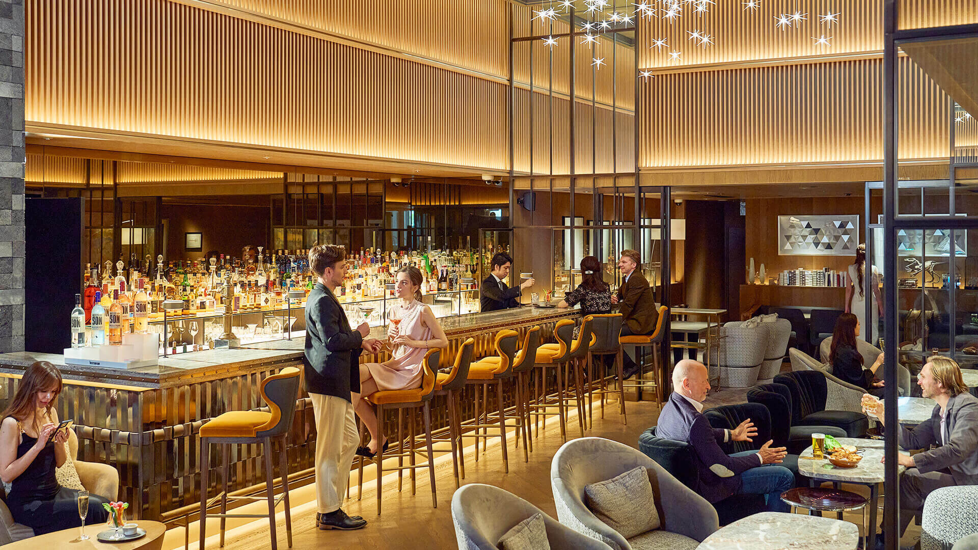 酒廊层高超过 5 米,空间开阔却不失私密感,拥有多处亮点:不仅有格调雅致的吧台区域,还有以精美日本中世纪画作为背景的舒适沙发,以及静谧的藏书角。