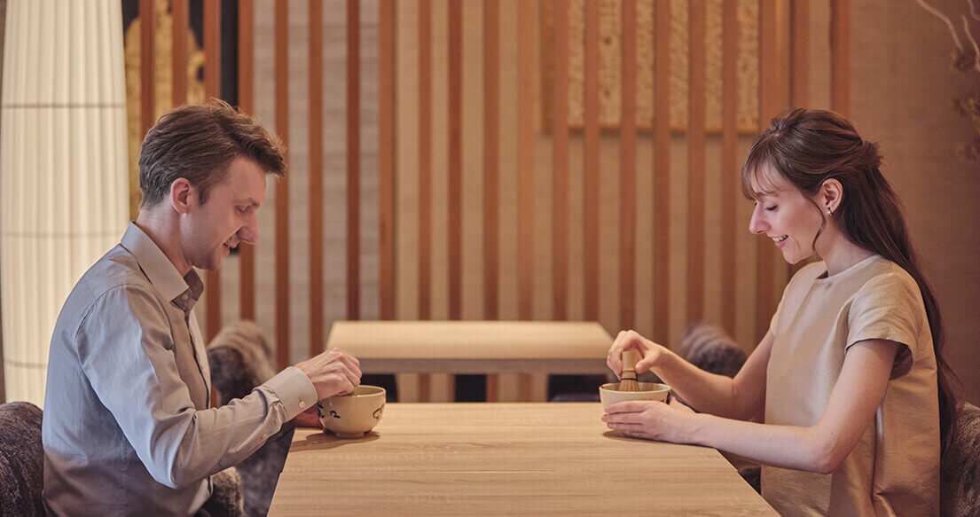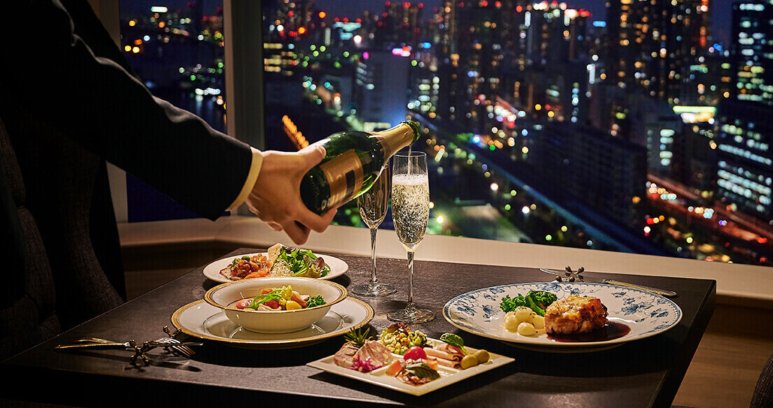 At the Japanese Lounge decorated in modern Japanese style, you can enjoy welcoming sweets prepared at the hotel. At dinner, you can savor Japanese foods such as sushi and tempura accompanied by sake. Alternatively, start your day with a lavish breakfast in a bento box composed by head chef Michiya Nakaune.